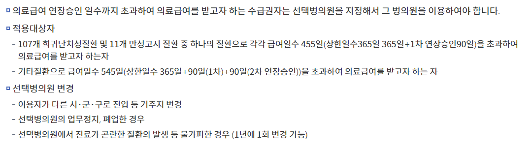 107개 희귀난치성질환 및 11개 만성고시 질환 중 하나의 질환으로 455일을 초과하거나, 기타질환으로 545일을 초과할 경우 적용됩니다. 선택병의원의 업무 정지, 폐업 등 불가피한 사유가 발생하면 변경이 가능합니다.