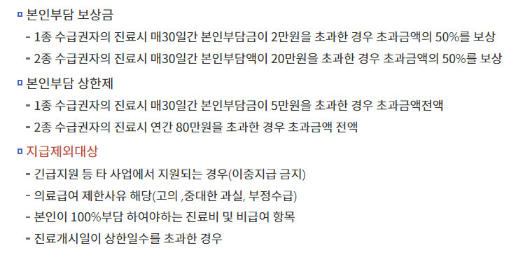 의료급여 수급권자는 본인 부담금 보상금과 상한제 지원을 받을 수 있습니다. 1종 수급권자는 진료시 매 30일간 본인부담금이 2만원을 초과한 경우 초과금액의 50%를 보상받으며, 매 30일간 5만원을 초과한 경우 초과금액 전액을 보상받습니다.