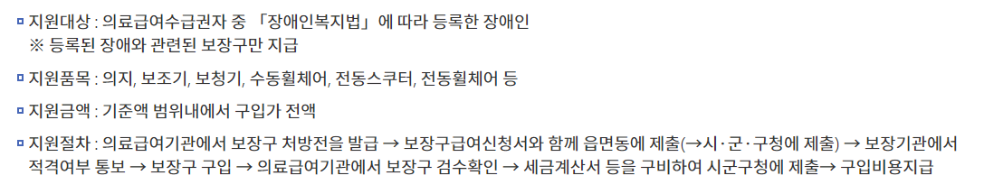 의료급여수급권자 중 「장애인복지법」에 따라 등록된 장애인에게 지원되는 제도입니다. 보장구에는 의지, 보조기, 보청기, 수동휠체어, 전동스쿠터 등이 포함되며, 구입가 전액을 지원받습니다.